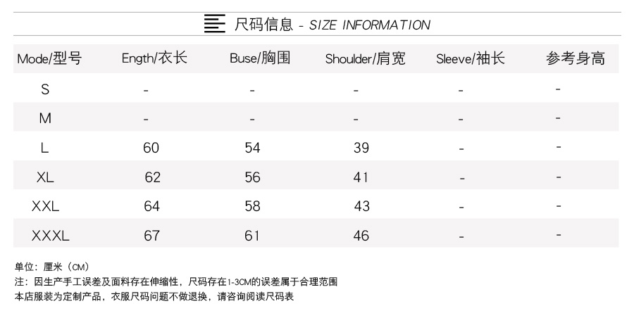产品尺码:155(S)165(M)170(L)175(XL)180(XXL)185(XXL)